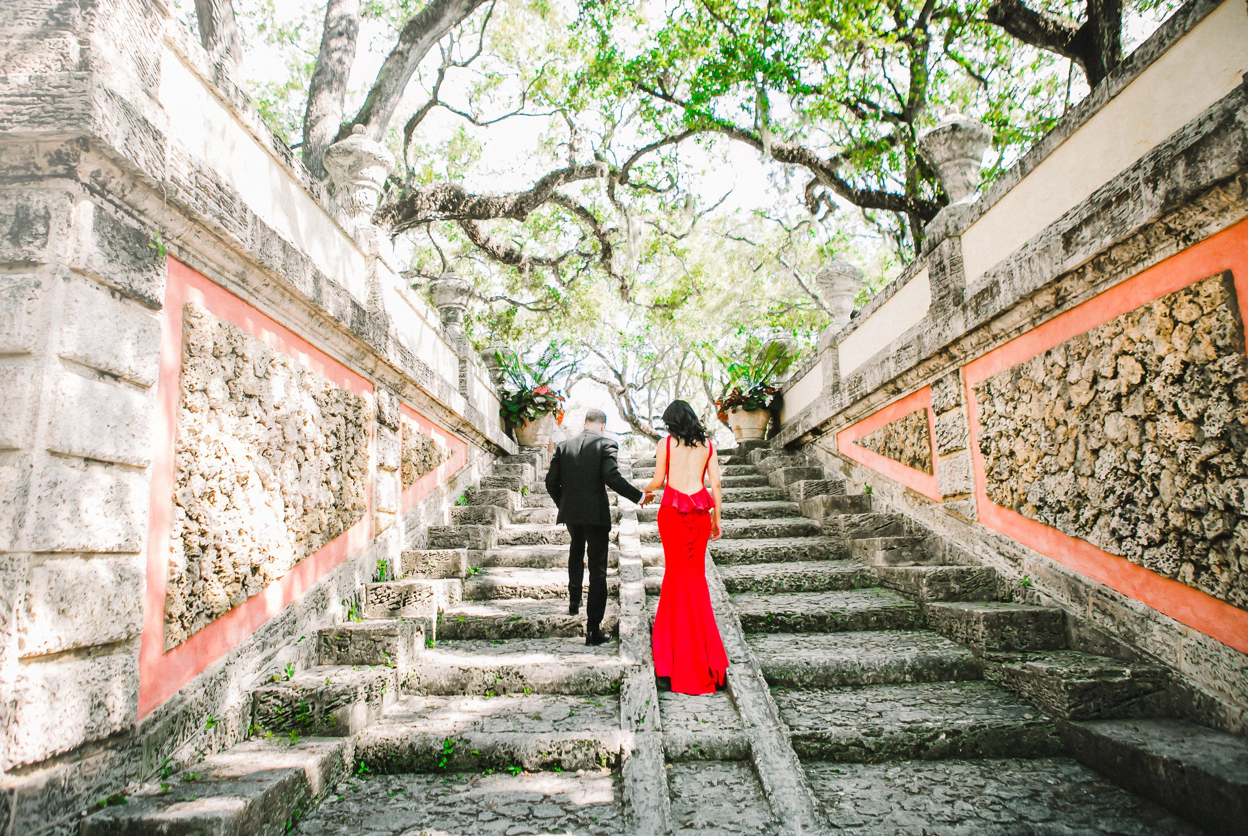 Our sweet couple trooped all through Vizcaya and we captured some beautiful shots and poses from their engagement photo session (a few steamy ones too!) Zara came prepared for her engagement photo shoot at Vizcaya Museum with two gowns, that were both perfect picks for the location!! Gown number one was a vibrant royal blue one-shouldered gown, and gown number two was a floor length (with train!) red, steamy low back gown.